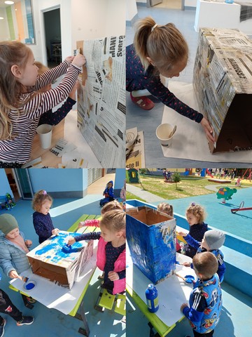 Eko aktivnosti nastavili smo upoznavanjem djece s pravilnim odvajanjem otpada. Zajedničkim snagama izradili smo spremnik za papir. Sami smo kaširali kutiju i obojali je u plavo kako bismo u SDB-u mogli odvajati papir, koji je ujedno i najčešća vrsta otpada s kojom se susrećemo. Kroz priču Pismo iz Zelengrada djeca su dodatno osvijestila važnost očuvanja prirode i brige za okoliš. Likovno smo se izražavali raznim tehnikama na temu planeta Zemlje.