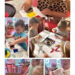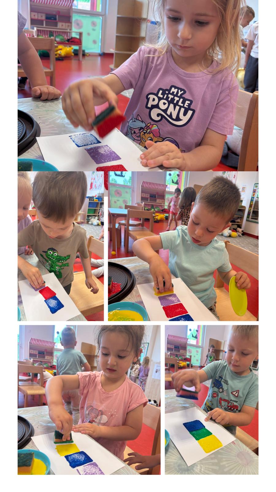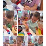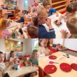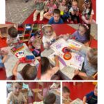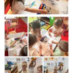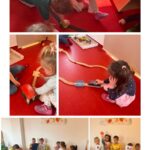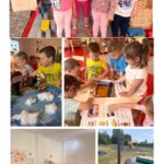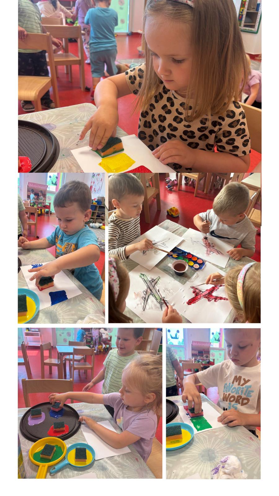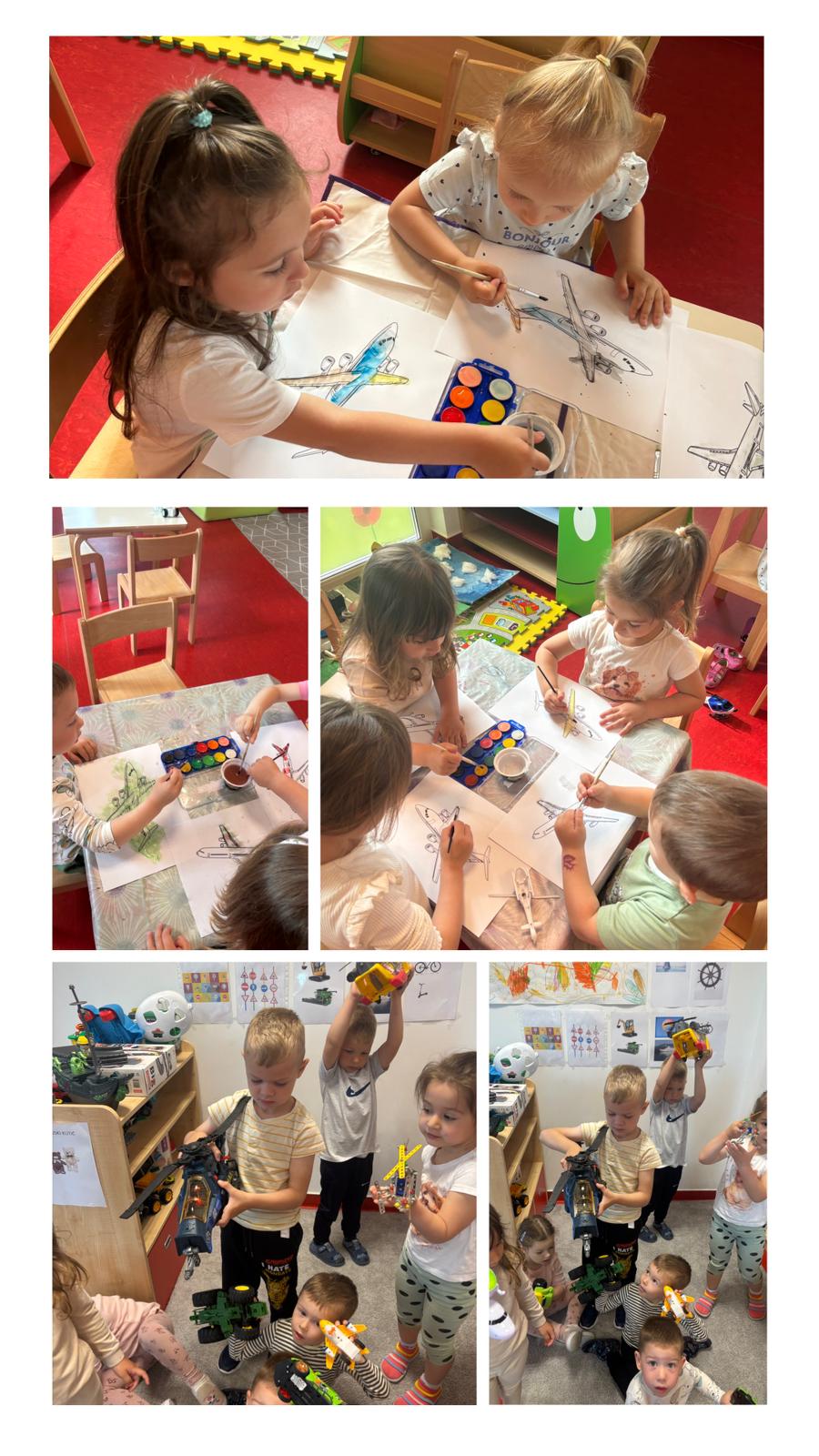 Promatrala su i uočavala razlike između aviona (helikopter, mig, avion) te bojala vodenim bojama bojanke na istu temu. Čitali smo i listali do sada najveću, viđenu slikovnicu “Vlakovi u neprilici” koja je uz tekst bila popraćena i manjim ilustracijama novim, do sad možda djeci ne poznatim riječima. Stolicama i kartonskim kutijama oblikovali smo vagone i odredili uloge (vlakovođa, putnici, kondukter) te improvizirali vožnju vlakom do Splita. Otiskivanjem spužvica umočenih u tempere, djeca su slikala vagone kojima su kasnije crtala kotače flomasterima.
