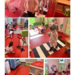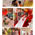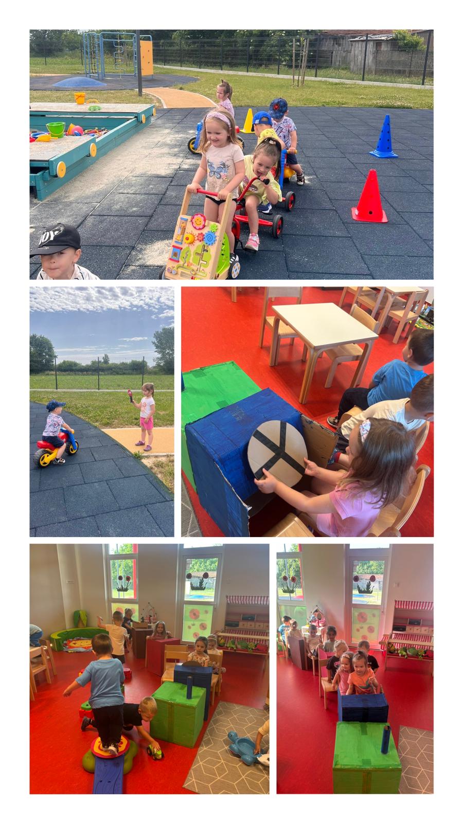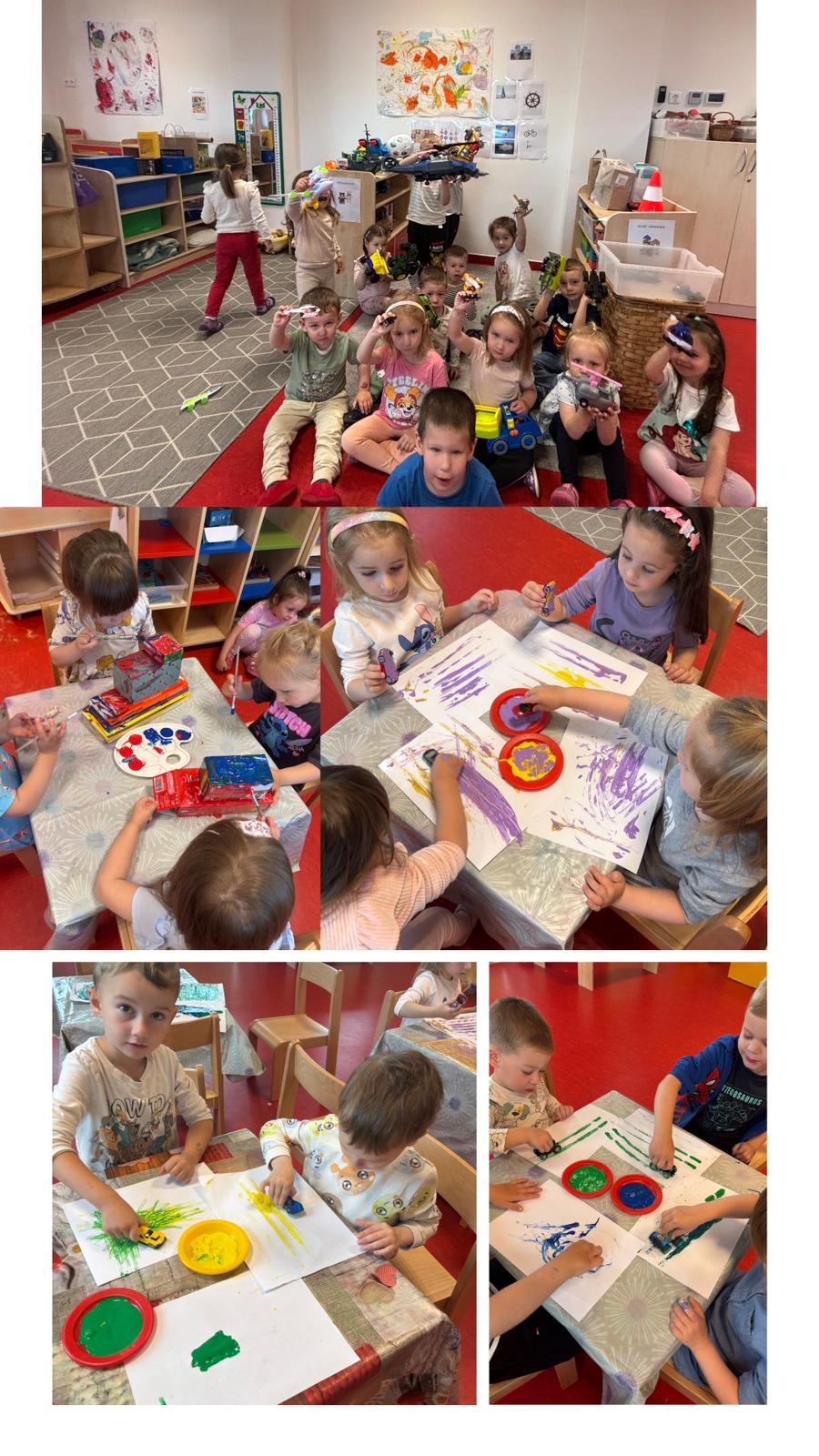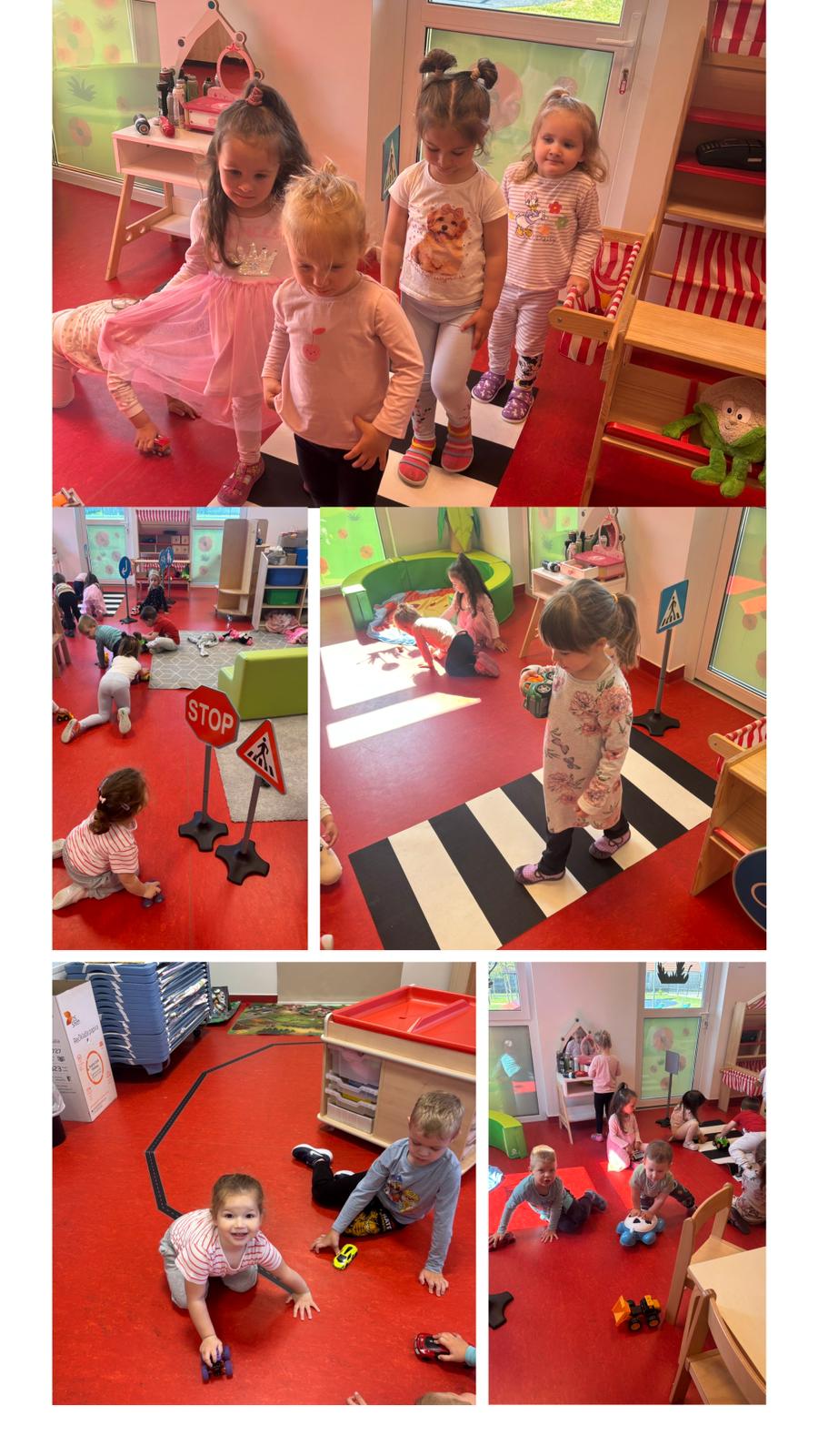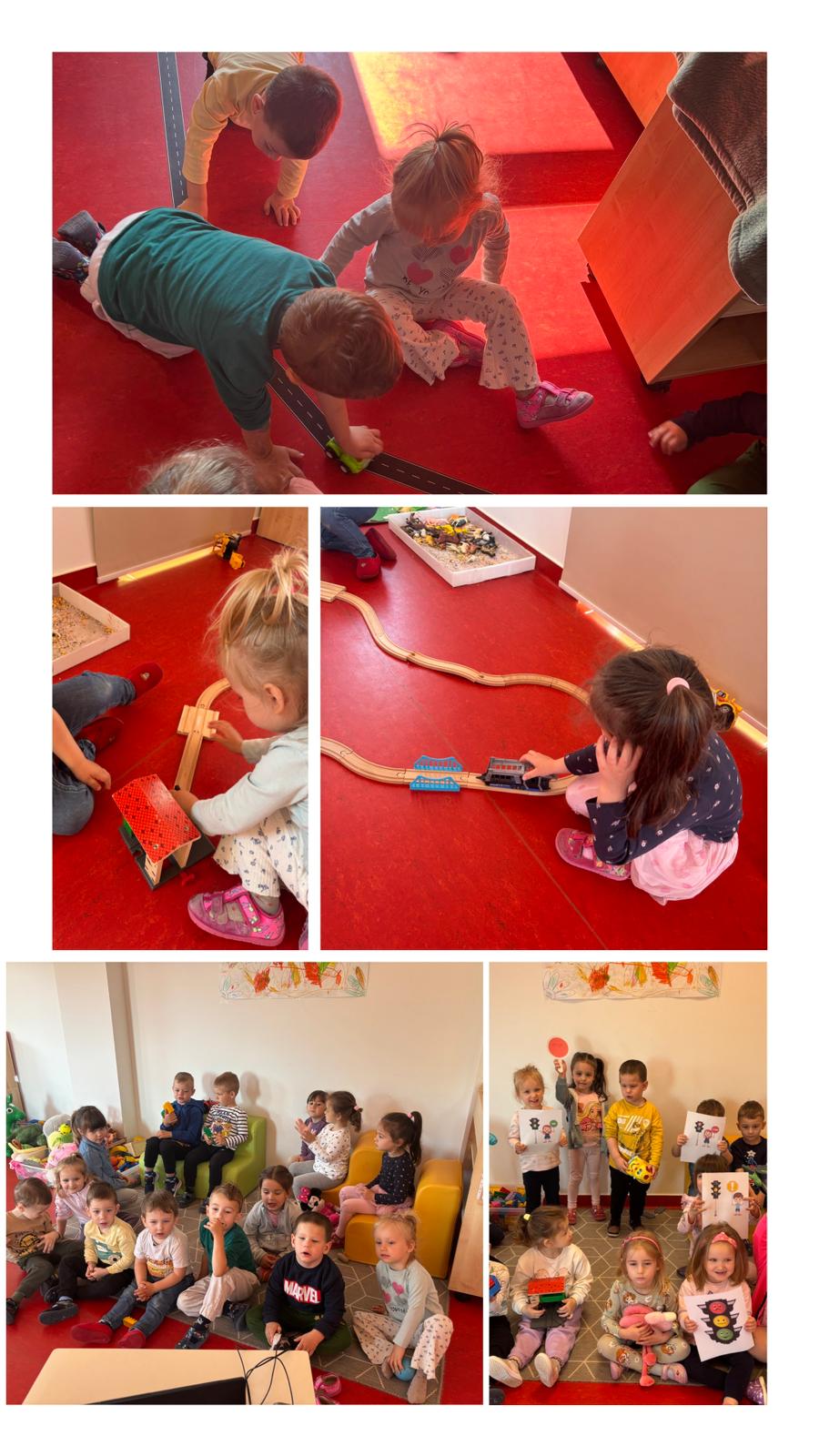 Uz pomoć rekvizita za tjelovježbu odgojiteljice su unutar SDB-a te u vanjskom prostoru vrtića oblikovale poligone s preprekama koje su djeca istraživala hodanjem, preskakivanjem, zaobilaženjem vozilima, guralicama ali i provlačenjem vozila. Petki su nam uglavnom bili zaduženi za donošenje i igru vozilima po želji! Djeci su, svakodnevno, na raspolaganju bile dostupne printane fotografije raznih vozila, a čija kretanja su osluškivala i realističnim zvukovima tijekom igre. Djeca su, osim izrađivanja, crtanja, slikanja i oslikavanja uvježbavala i grafomotoriku prateći i spajajući linije tragova određenih vozila, prepoznavajući i spajajući sjene s njihovim vozilima, količinom, brojevima itd.