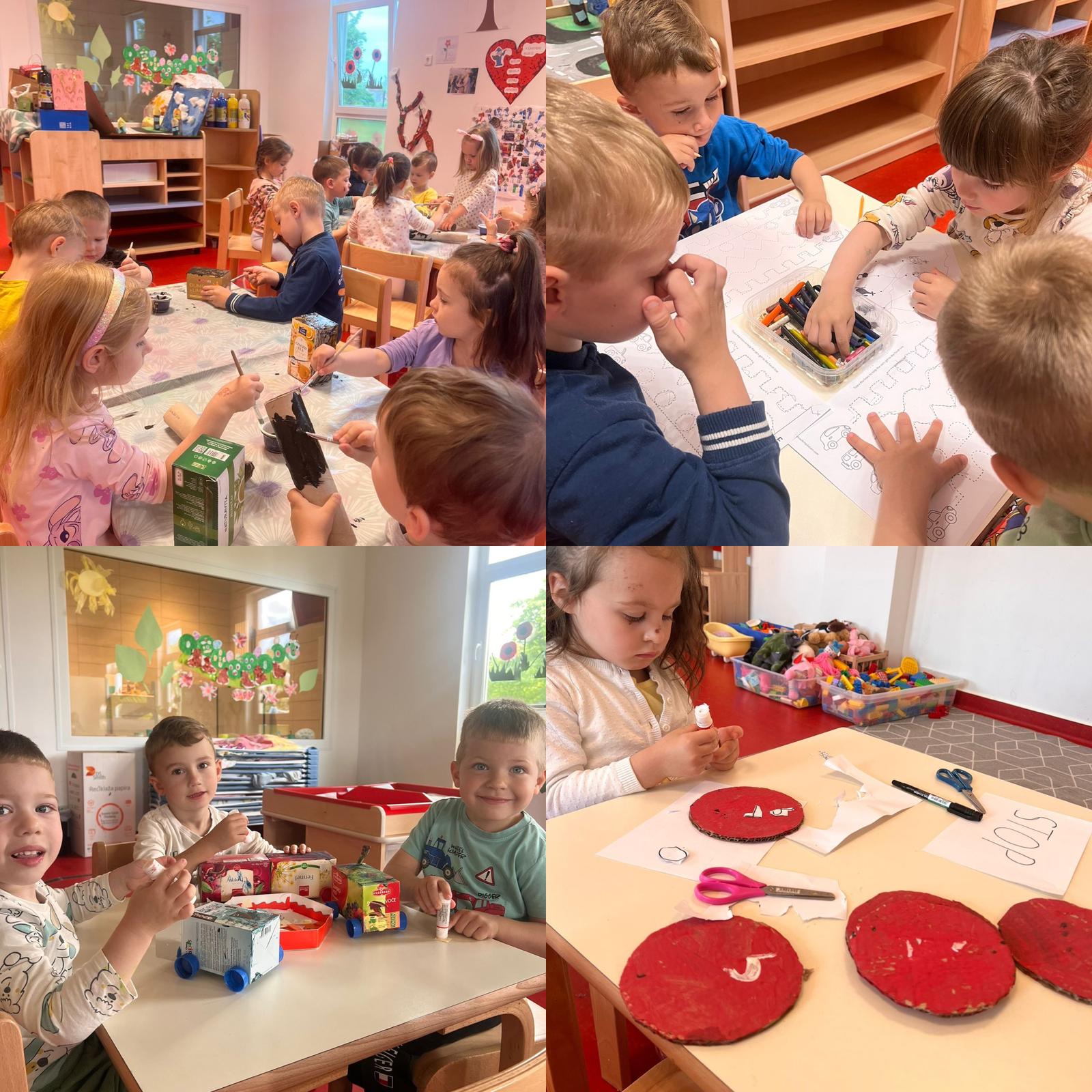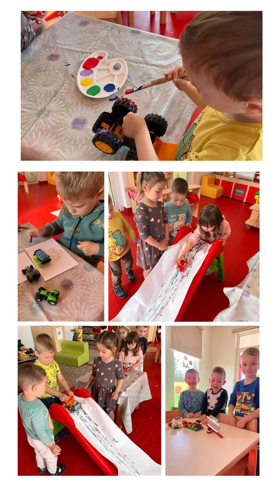 Zamolile smo roditelje da nam donesu viška kutija i čepova koji su nam poslužili za oslikavanje temperama i izradu vozila po želji. Opcrtavali smo flomasterima i naša vozila po želji koja smo tada bojali, ukrašavali i izrezivali. Oslikavali smo kotače naših vozila temperama i promatrali tragove koje ostavljaju po papiru prilikom “vožnje”. Ponovili smo aktivnost, no ovaj put spuštajući vozila po “cesti” tobogana, promatrajući čije će vozilo najdalje odjuriti prilikom spusta. Istraživali smo na taj način kako obojati kotače da ostave što jasniji trag te kako pravilno postaviti vozilo da bi se ono najdalje spustilo.