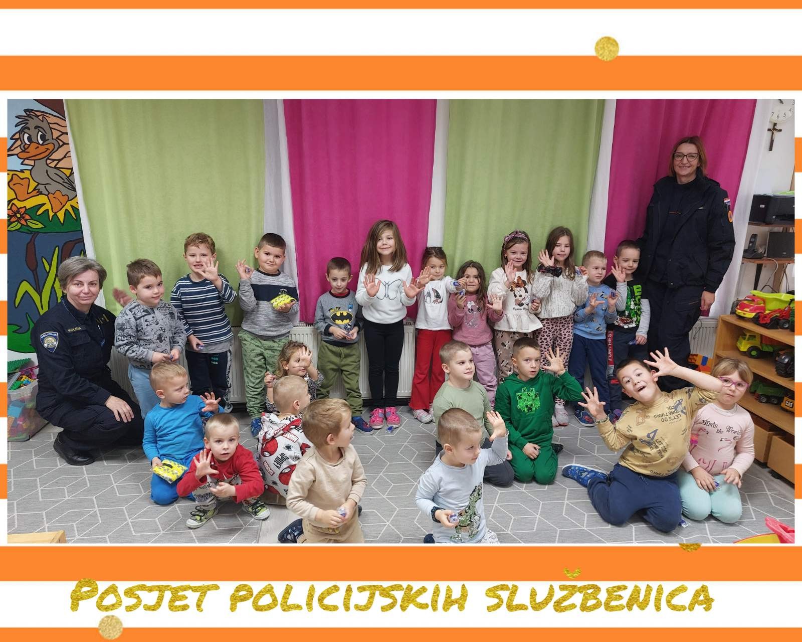Krajem mjeseca posjetile su nas policijske službenice, s kojima smo proveli edukativnu i zanimljivu aktivnost. Zajedno smo zaustavljali automobile te educirali vozače o važnosti korištenja sigurnosnog pojasa i pravilnog ponašanja u prometu. Djeca su na zanimljiv i njima prilagođen način učila o prometnoj sigurnosti i važnosti odgovornog ponašanja.