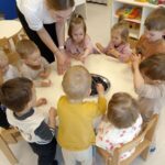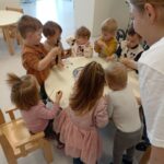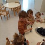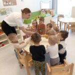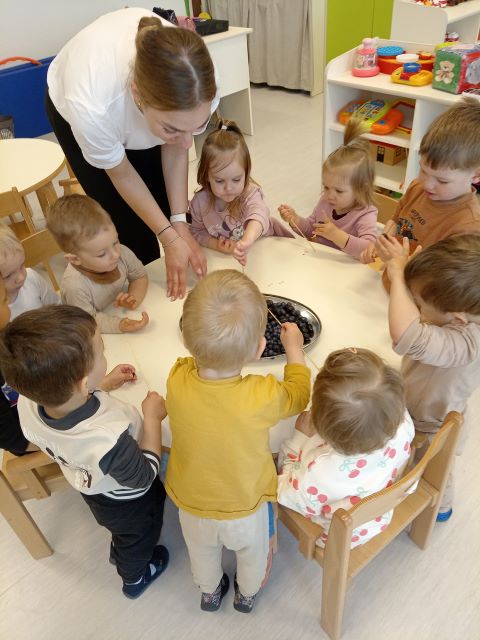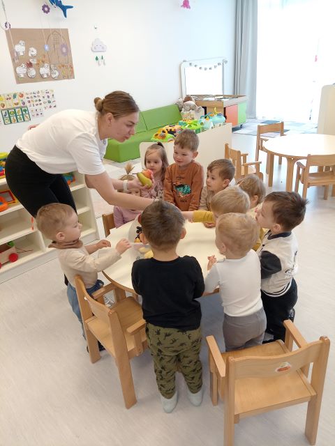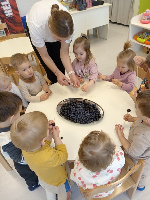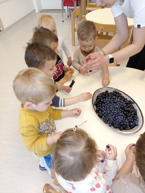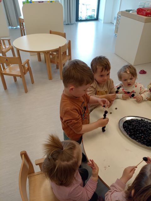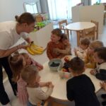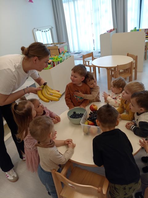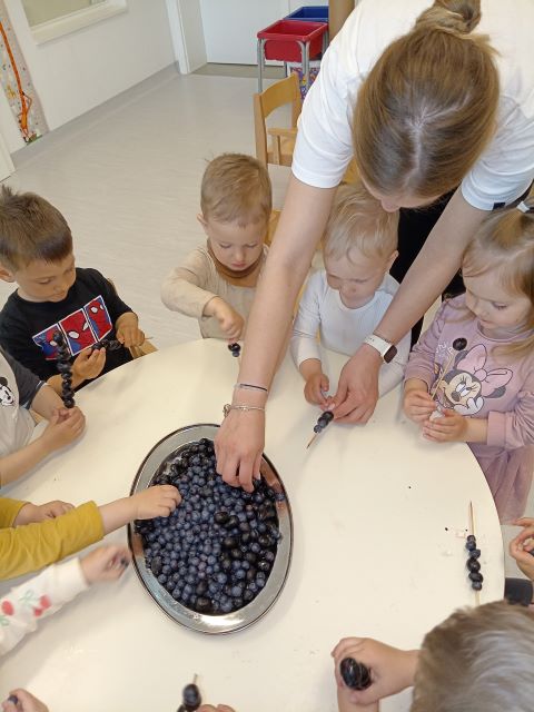 Kroz istraživanje teme vezane uz zdravu prehranu te važnosti konzumiranje voća, u grupu nam je došla nutricionistica Elena Marčić. Ispričala je djeci zašto je važno jesti voće i što se sve nalazi u pojedinom voću. Djeca su istraživala voće svim osjetilima. Imenovala su voće, opisivala ga i istraživala njegov okus. Od bobica grožđa i borovnica slagali su voćne ražnjiće.
