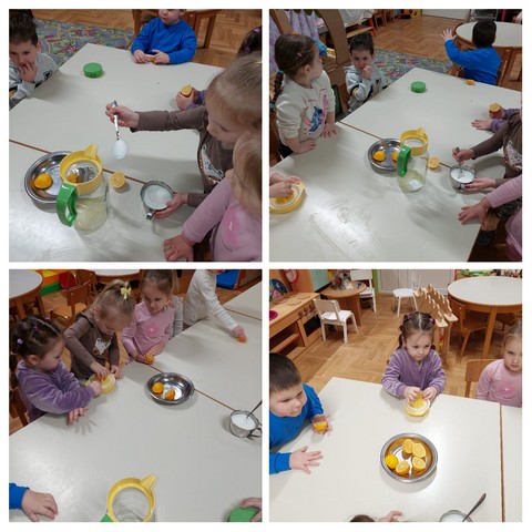 Aktivno su se uključila u praktične i istraživačke aktivnosti – od samog odabira citrusnog voća do cijeđenja, gnječenja, kušanja, mirisanja, prelijevanja soka u čaše. Istraživali su koristeći sva osjetila, uvježbavali finu motoriku i koordinaciju oko-ruka, usvajali praktične vještine potrebne u svakodnevnom životu.